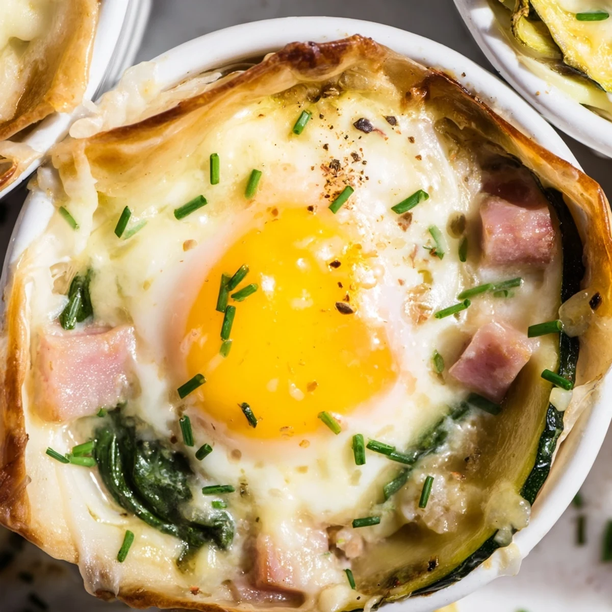 The morning sun was streaming through my kitchen window when I first attempted this French inspired dish. I had half a box of puff pastry leftover from a dinner party the night before and a craving for something that felt indulgent yet simple. My roommate wandered in, coffee in hand, and watched me layer vegetables and ham into ramekins with skeptical curiosity. When we pulled those golden topped dishes from the oven forty minutes later, the runny yolks mixing into that velvety cheese sauce changed both our minds completely.