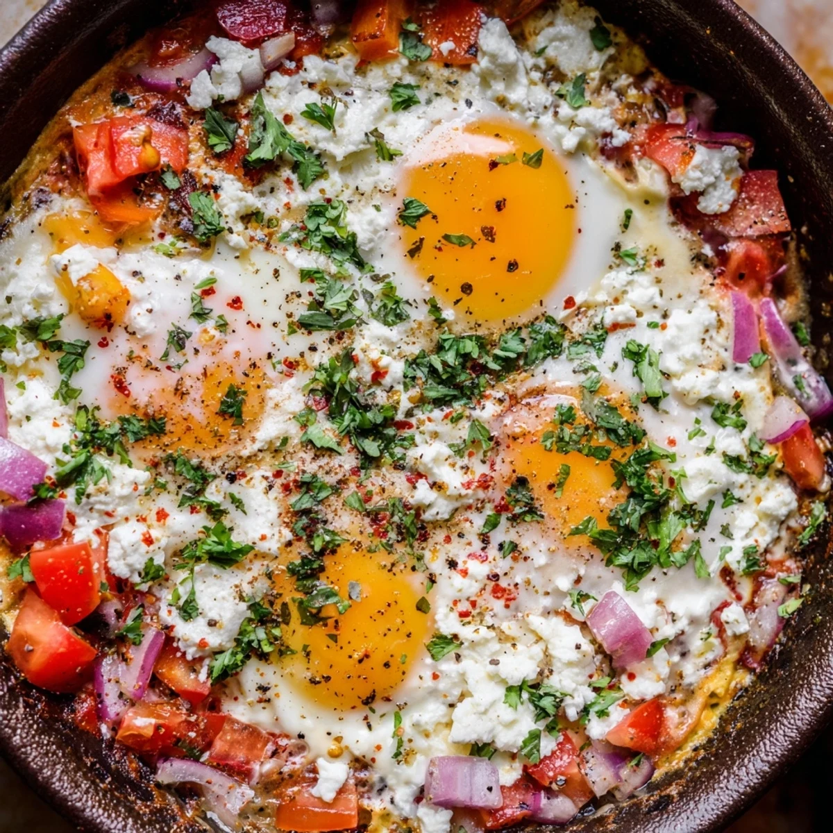 This Mediterranean-inspired dish combines creamy feta cheese with perfectly baked eggs, creating a rich and satisfying breakfast. The vegetables—tomatoes, red bell peppers, and red onions—are sautéed until softened, releasing their natural juices that mingle with melted feta. Fresh garlic, oregano, and parsley add aromatic depth, while a hint of red pepper flakes provides gentle warmth.
