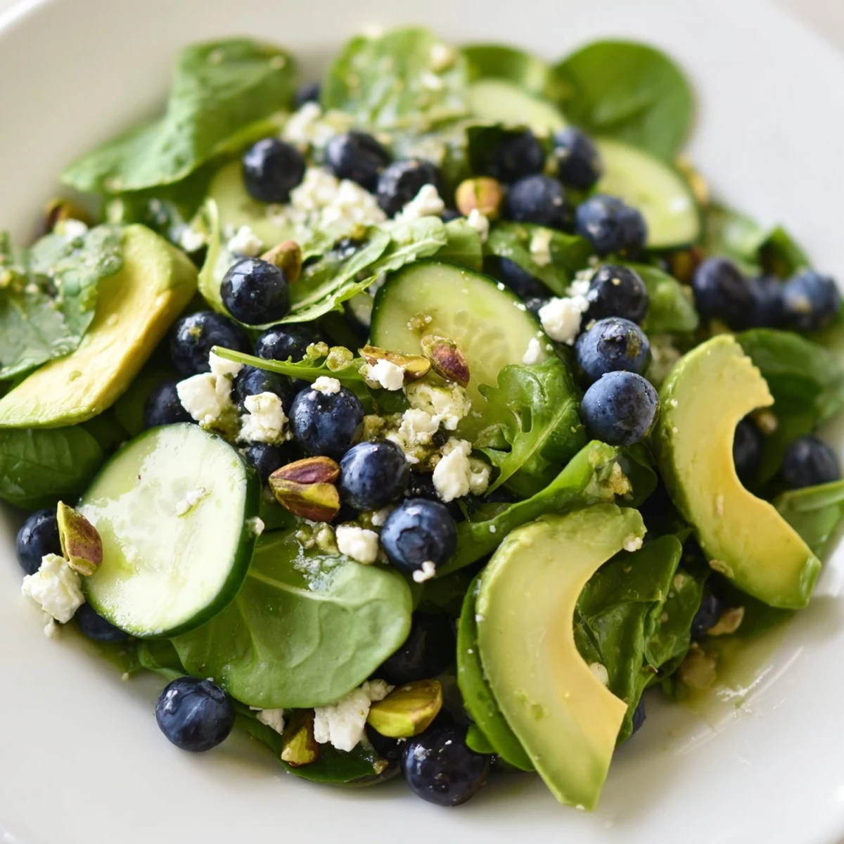 This refreshing bowl brings together the sweetness of fresh blueberries with the satisfying crunch of shelled pistachios. Mixed spring greens like baby spinach and arugula provide a tender base, while cool cucumber slices and creamy avocado add texture and richness.