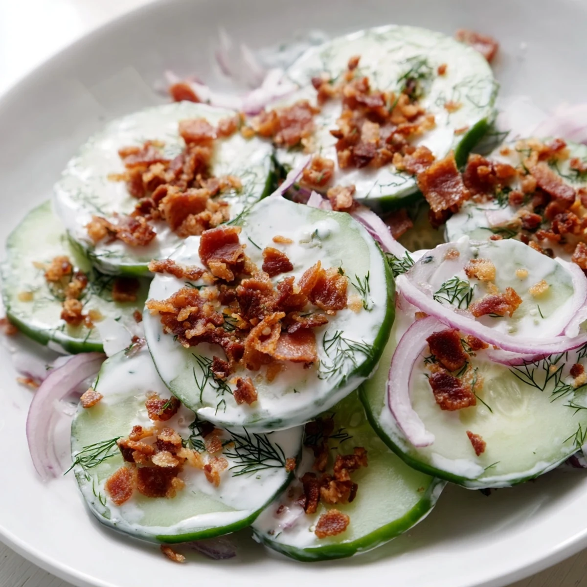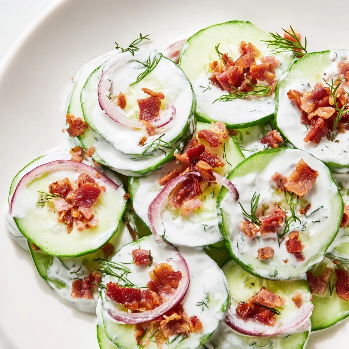 This vibrant salad combines thinly sliced cucumbers with savory crumbled bacon, creating a perfect balance of fresh and smoky flavors. The light dressing, featuring Greek yogurt and apple cider vinegar, adds a tangy finish without overwhelming the vegetables. Ready in just 25 minutes, this dish works wonderfully for meal prep or served immediately.