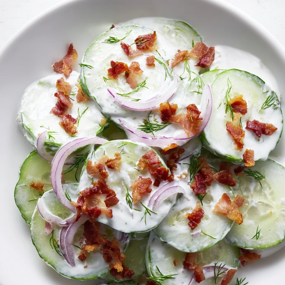 Last summer my garden exploded with cucumbers and I found myself eating them straight off the vine while standing in the backyard. That casual snacking habit evolved into this salad when my brother mentioned he never liked cucumber dishes until someone added bacon to the mix at a neighborhood block party.