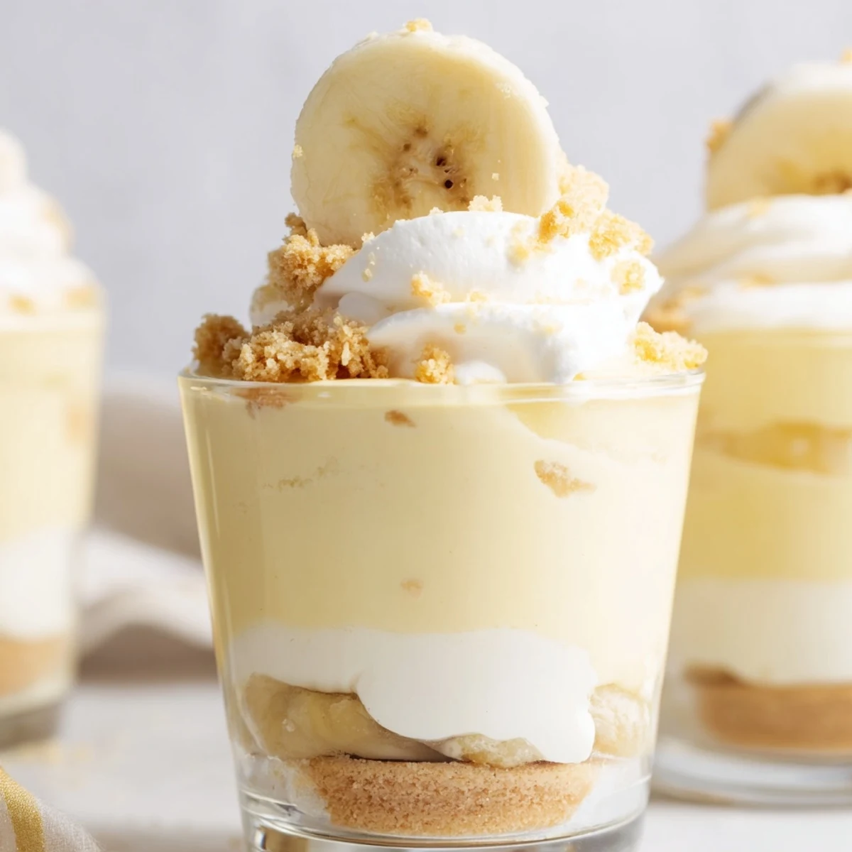 - Sprinkle each cup with additional wafer crumbs, add fresh banana slices, and crown with a dollop of whipped cream if desired.