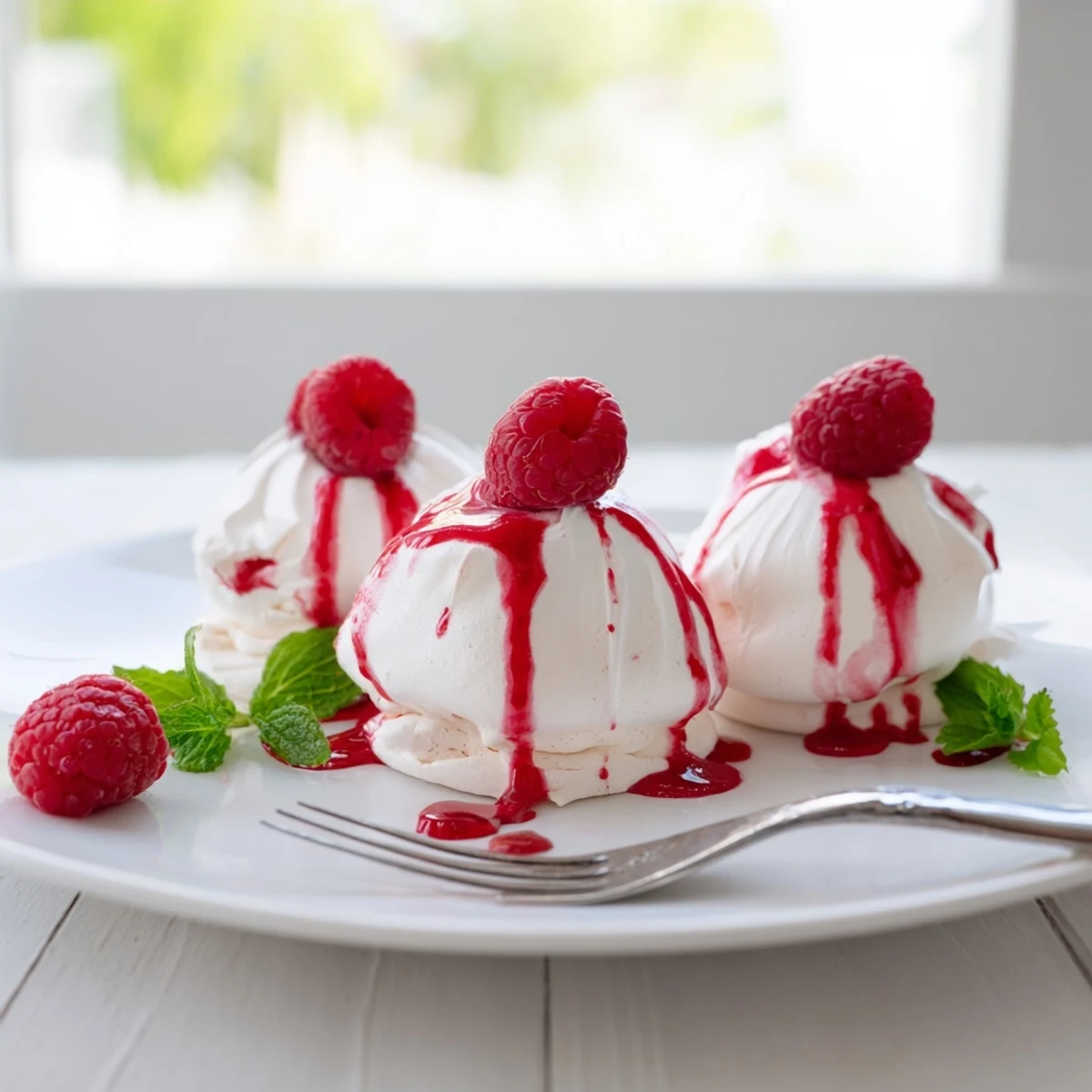 These elegant Pavlova bombs feature crisp meringue shells with irresistibly soft, marshmallow-like centers. Each delicate shell is hand-filled with lightly sweetened vanilla whipped cream, then generously drizzled with a vibrant raspberry coulis that balances sweetness with refreshing tang. The contrast between the crunchy exterior, pillowy interior, and silky cream creates an unforgettable textural experience.