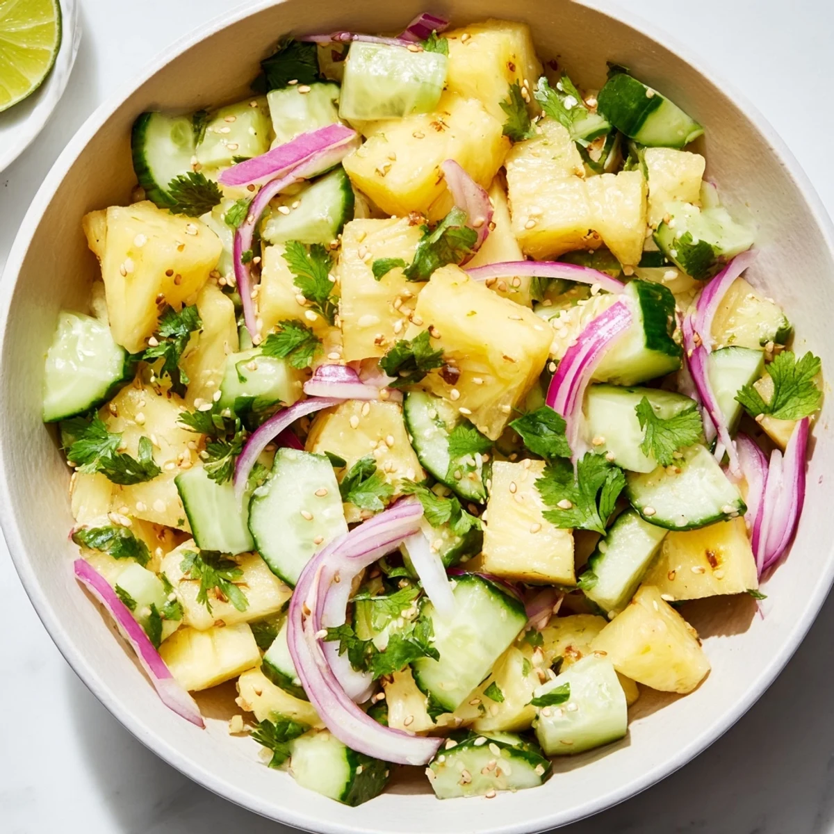 - In a large salad bowl, toss together the diced pineapple, cucumber, thinly sliced red onion, and chopped cilantro until evenly distributed
